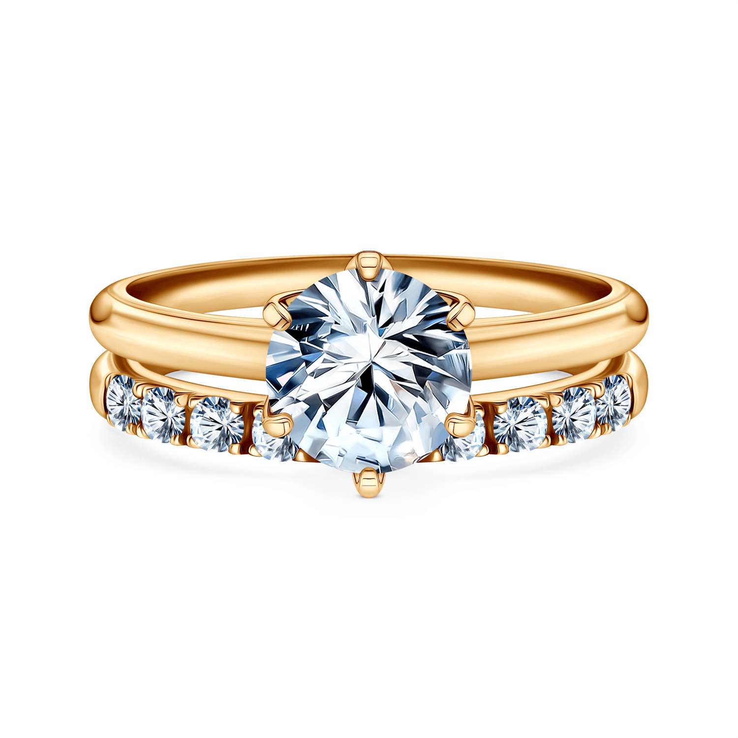 Deliberately shaped wedding ring fits perfectly into the engagement ring, creating unique and unprecedented composition.