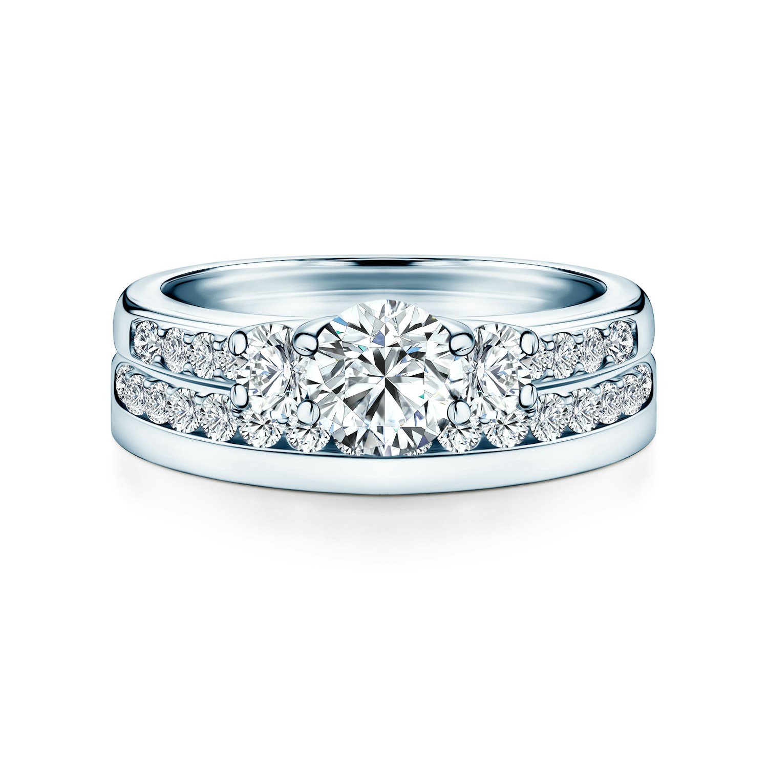 Deliberately shaped wedding ring fits perfectly into the engagement ring, creating unique and unprecedented composition.