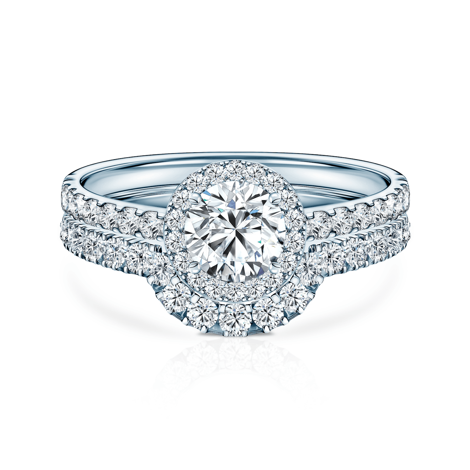 Deliberately shaped wedding ring fits perfectly into the engagement ring, creating unique and unprecedented composition.
